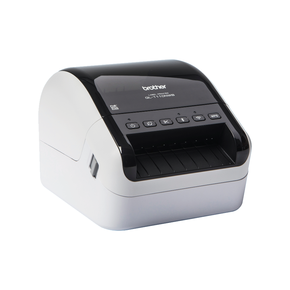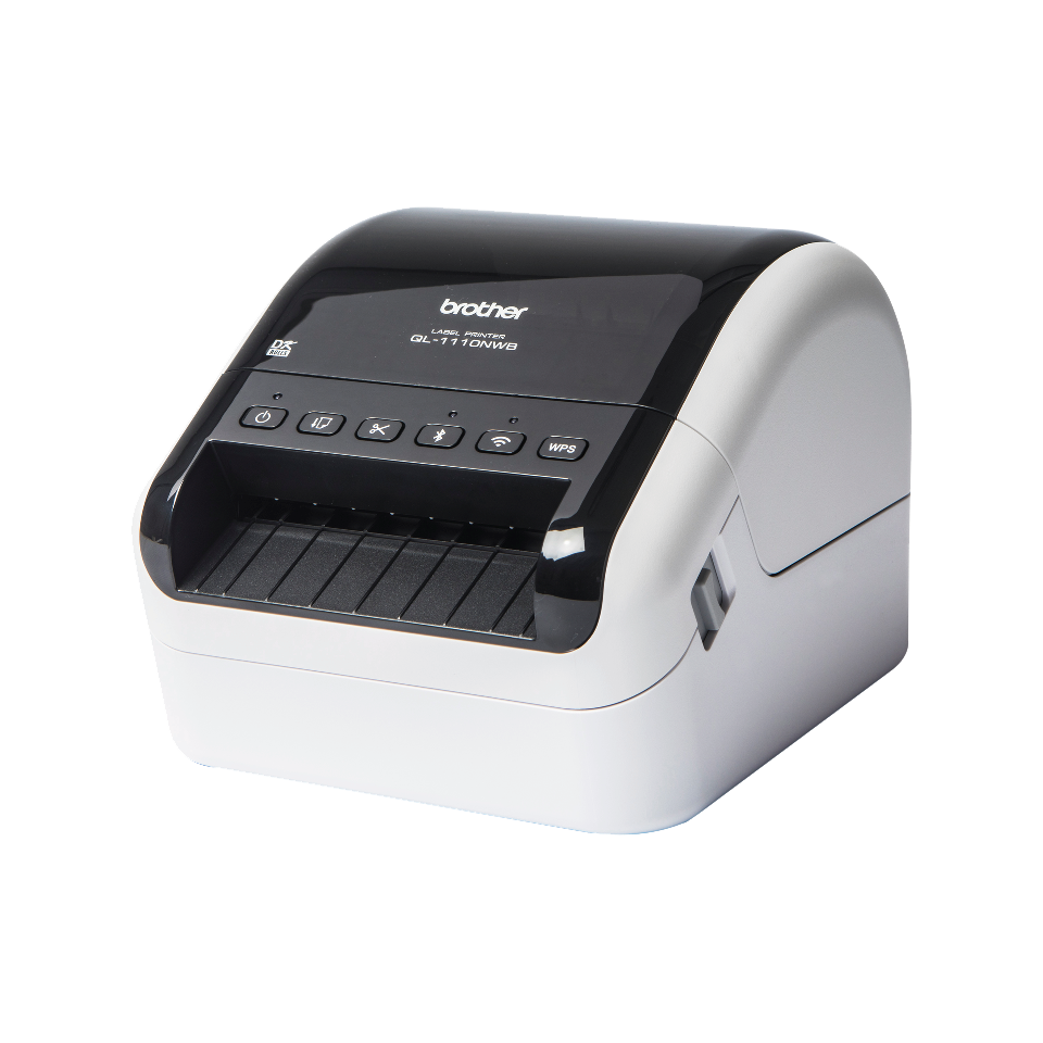 QL-1110NWB labelprinter er perfekt, når der skal afsendes post og pakker. Den har både kablet og trådløst netkort og en printbredde op til 101,6 mm.